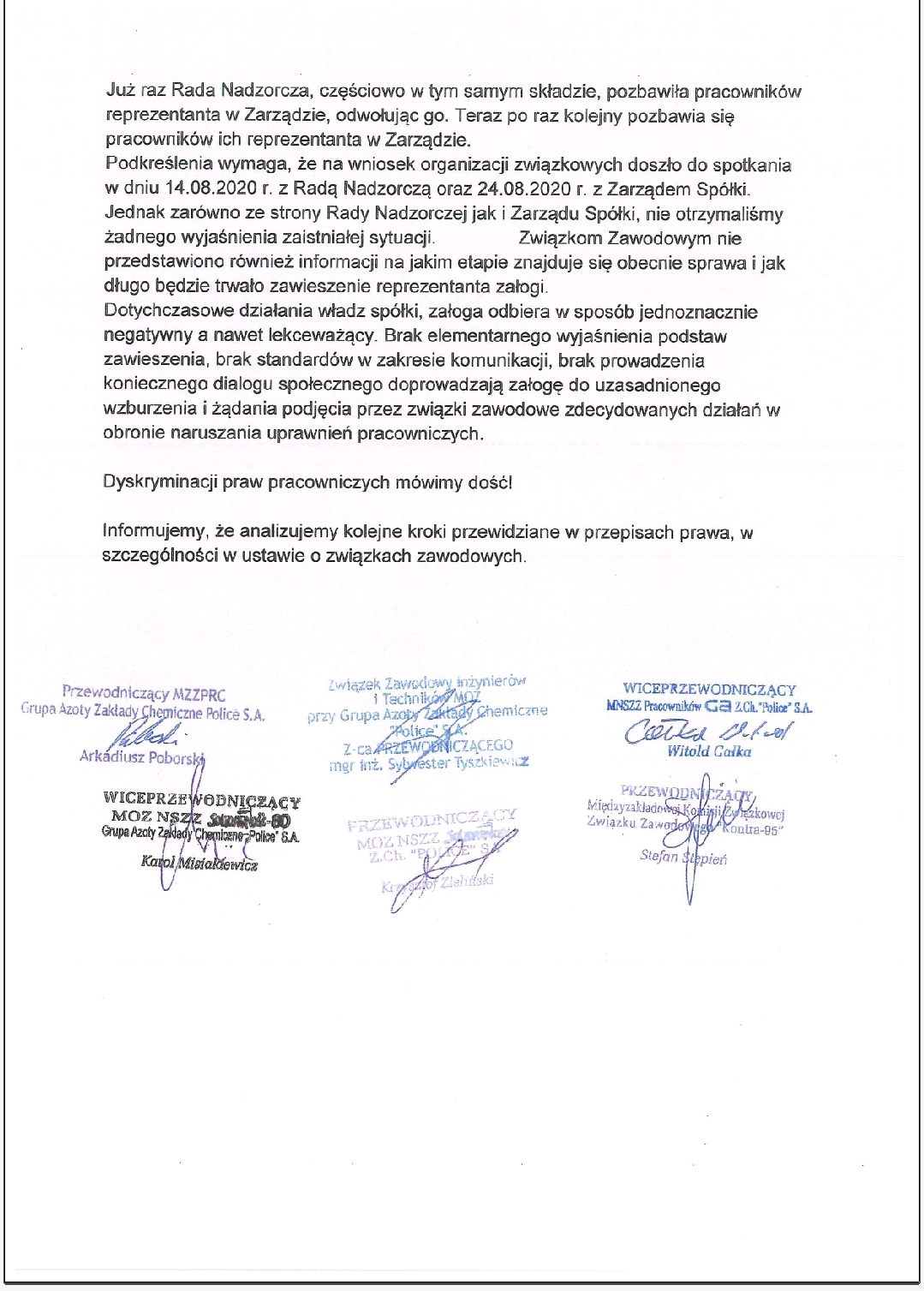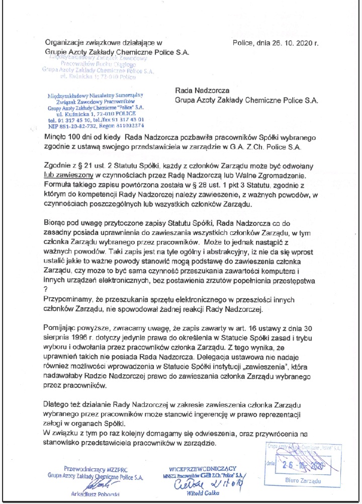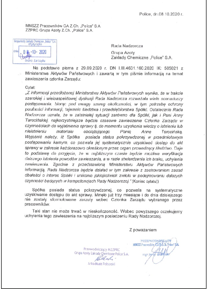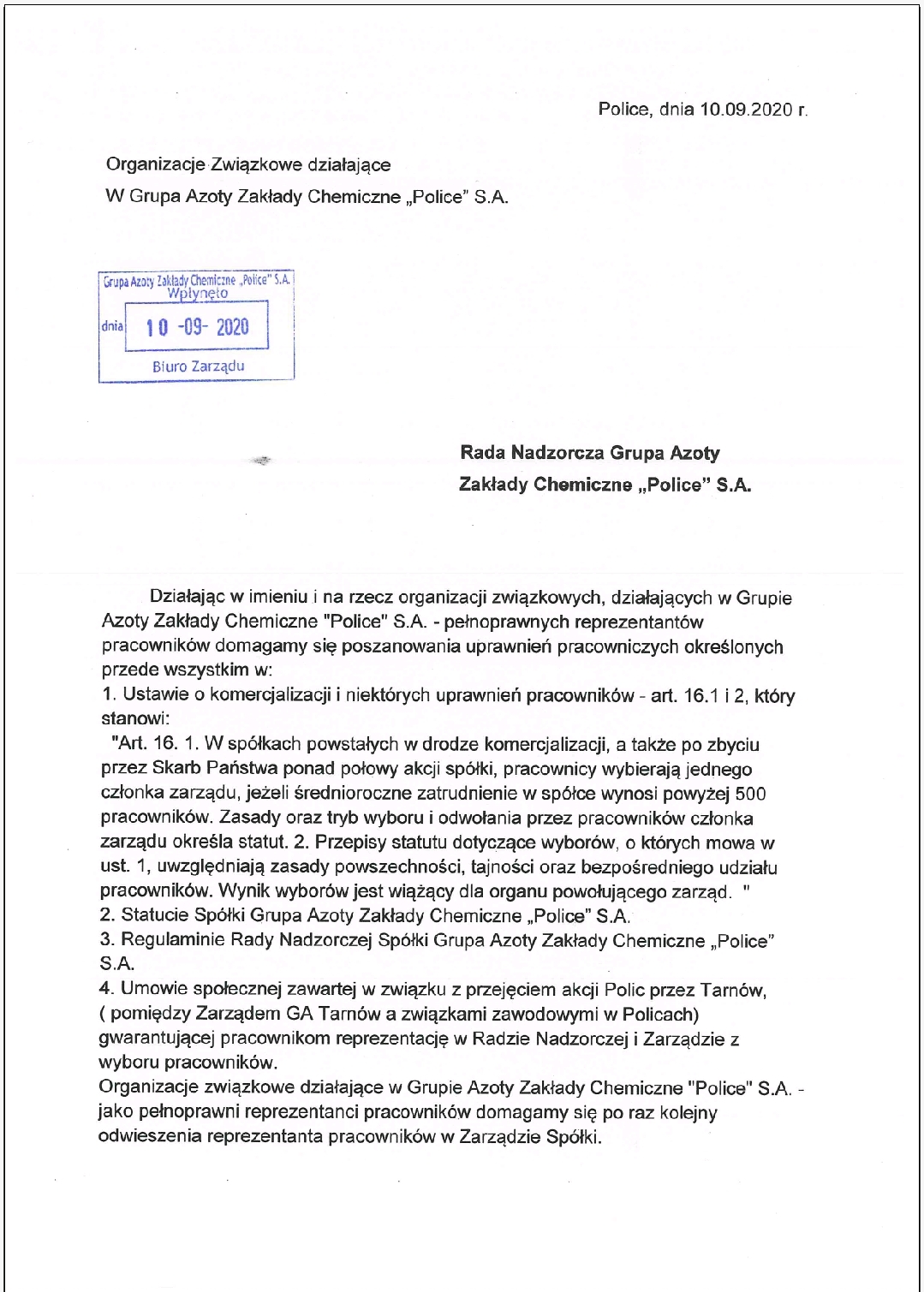 Pismo organizacji związkowych skierowane do Zarządu Grupa Azoty Zakłady Chemiczne Police S.A.