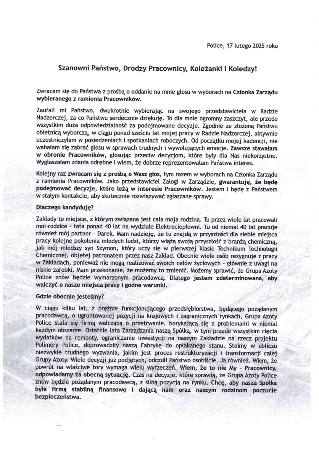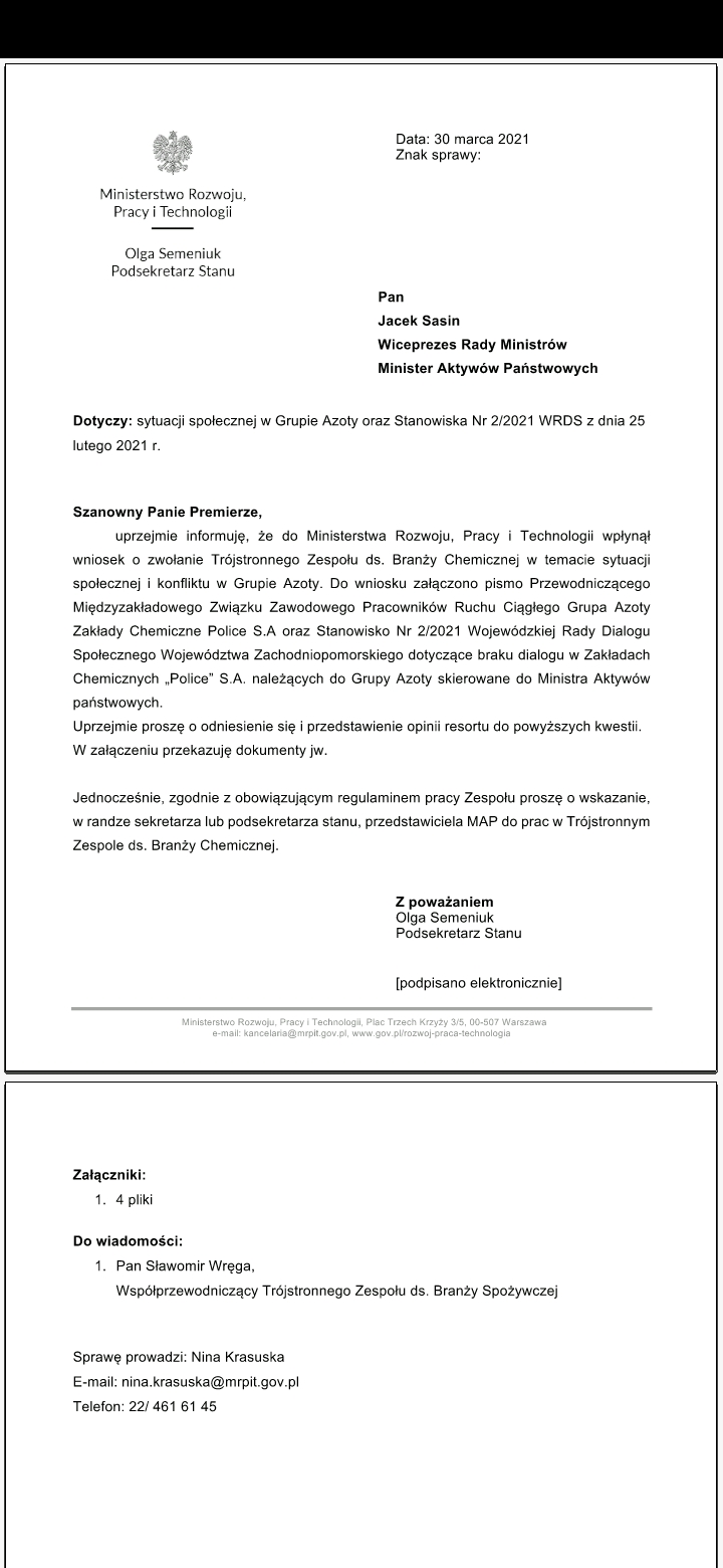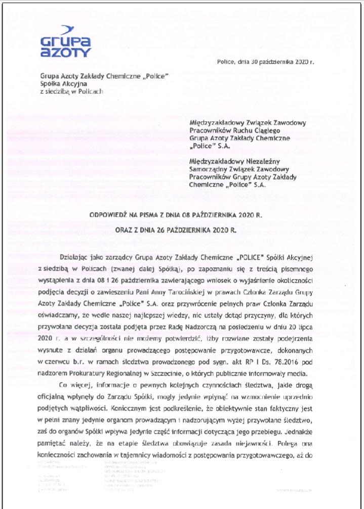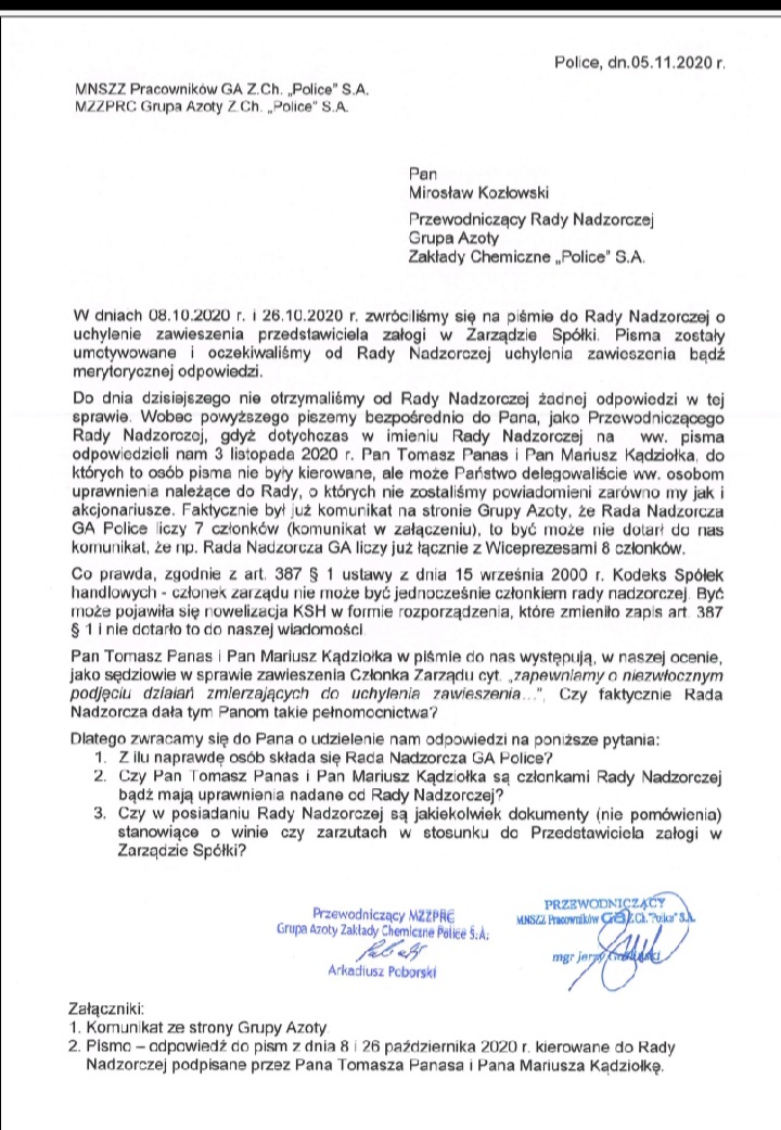 Pismo organizacji związkowych skierowane do Zarządu Grupa Azoty Zakłady Chemiczne Police S.A.
