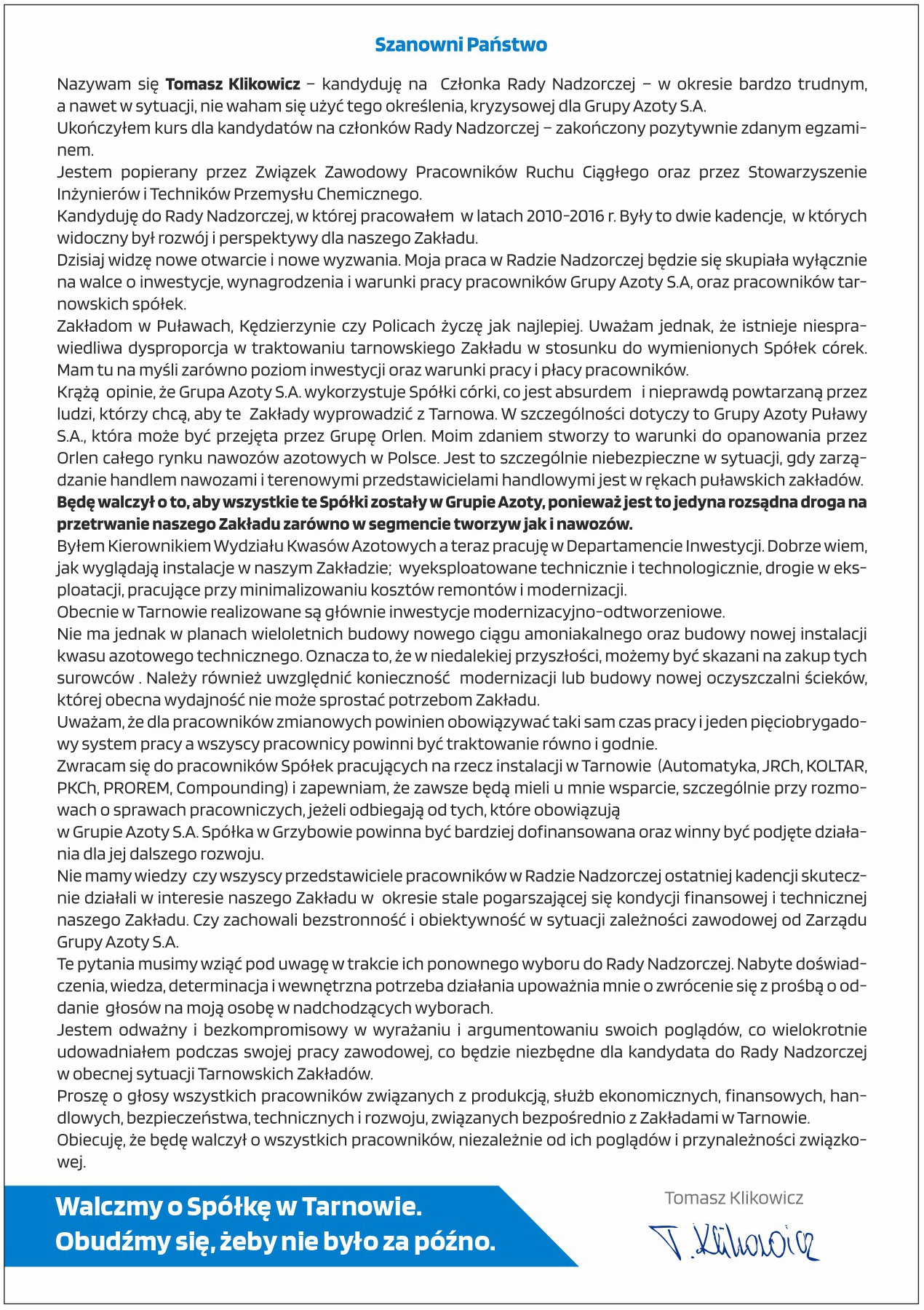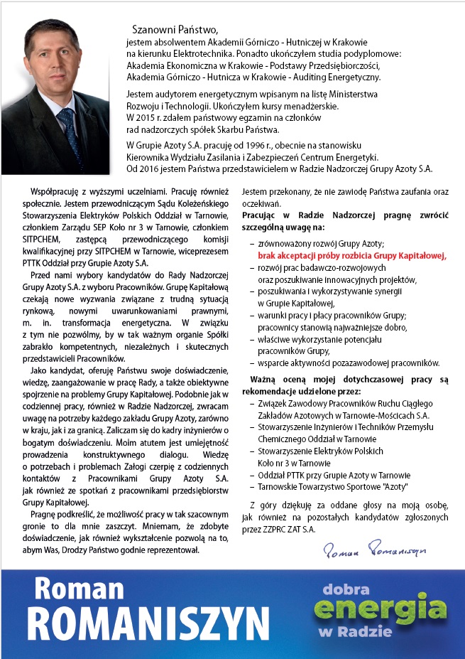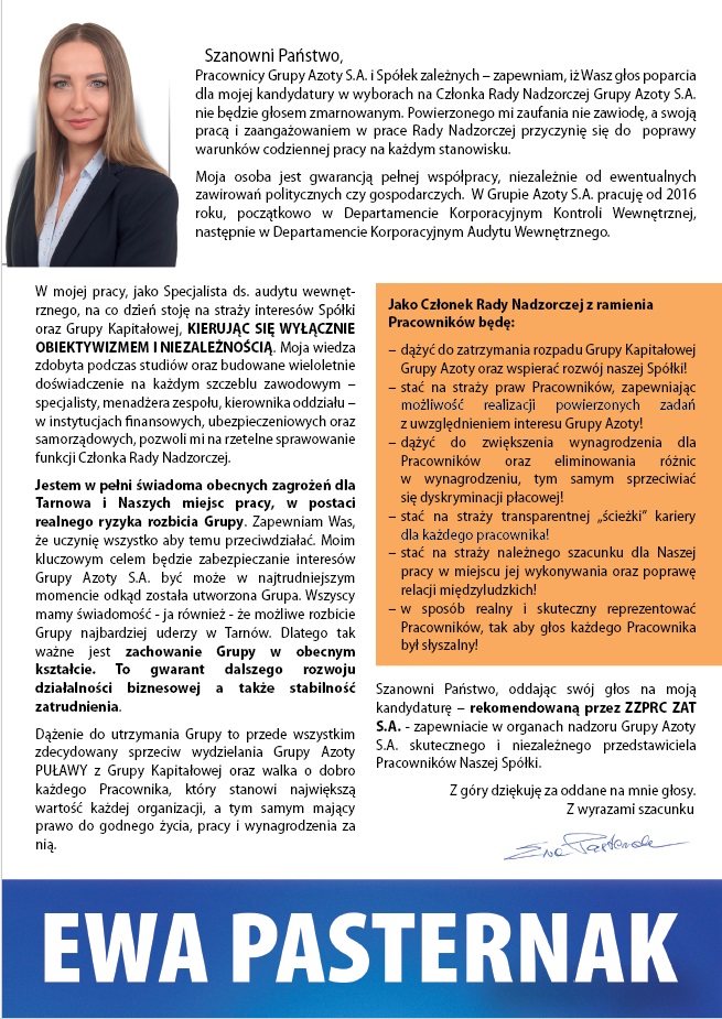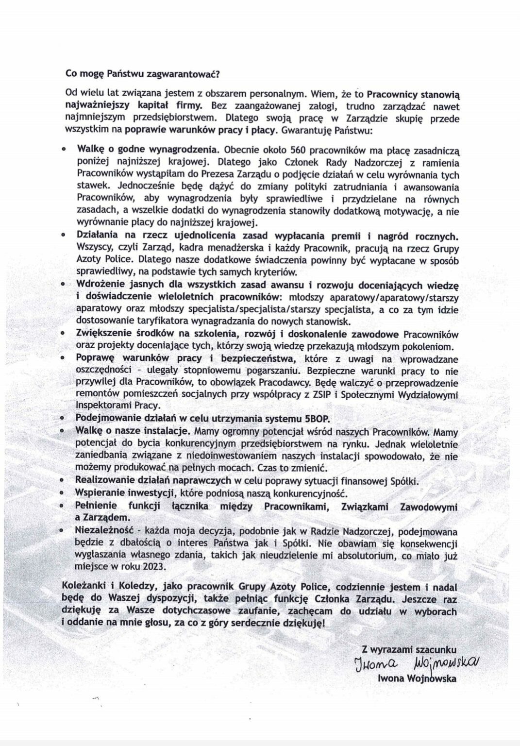 Czy koszty naprawy finansów Spółek Grupy Azoty Police mają ponieść pracownicy i to głównie produkcyjni? Nie ma na to zgody! Zawieszenie pobierania opłat za znak towarowy przez G.A. Tarnów przyniesie więcej oszczędności niż zamach na prawa pracownicze nabyte przez wiele lat i zapisane w ZUZP. Każdy uczciwy gospodarz naprawę zaczyna od siebie. Do dzisiaj nie przedstawiono nam planu sprzedaży, planu produkcji, właściwie żadnego planu naprawczego. Oczywiście nie licząc tego zawartego w tym piśmie. Tak pięknie o szacunku dla pracowników wypowiadał się na pierwszym spotkaniu Pan Adam Leszkiewicz Prezes Zarządu Grupy Azoty.