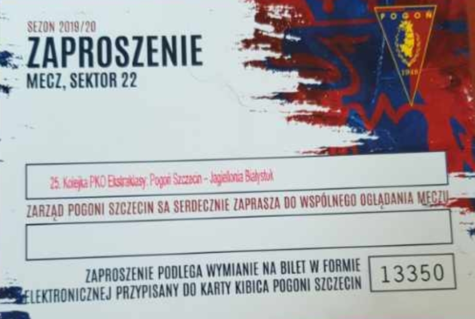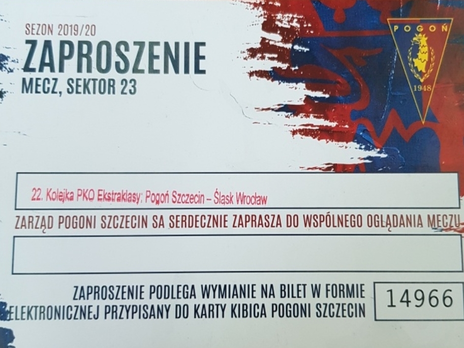 Zapraszamy członków naszego Związku po odbiór biletów na mecz Pogoń Szczecin – Śląsk Wrocław który odbędzie się 15.02.2020