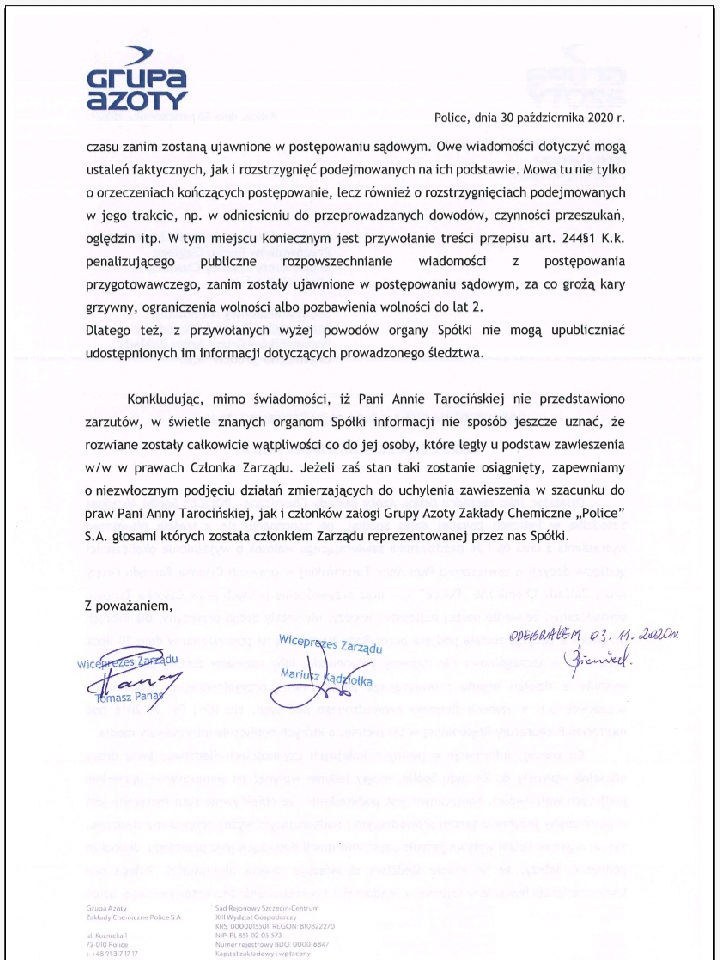 Pisma skierowane do Zarządu Grupy Azot S.A.