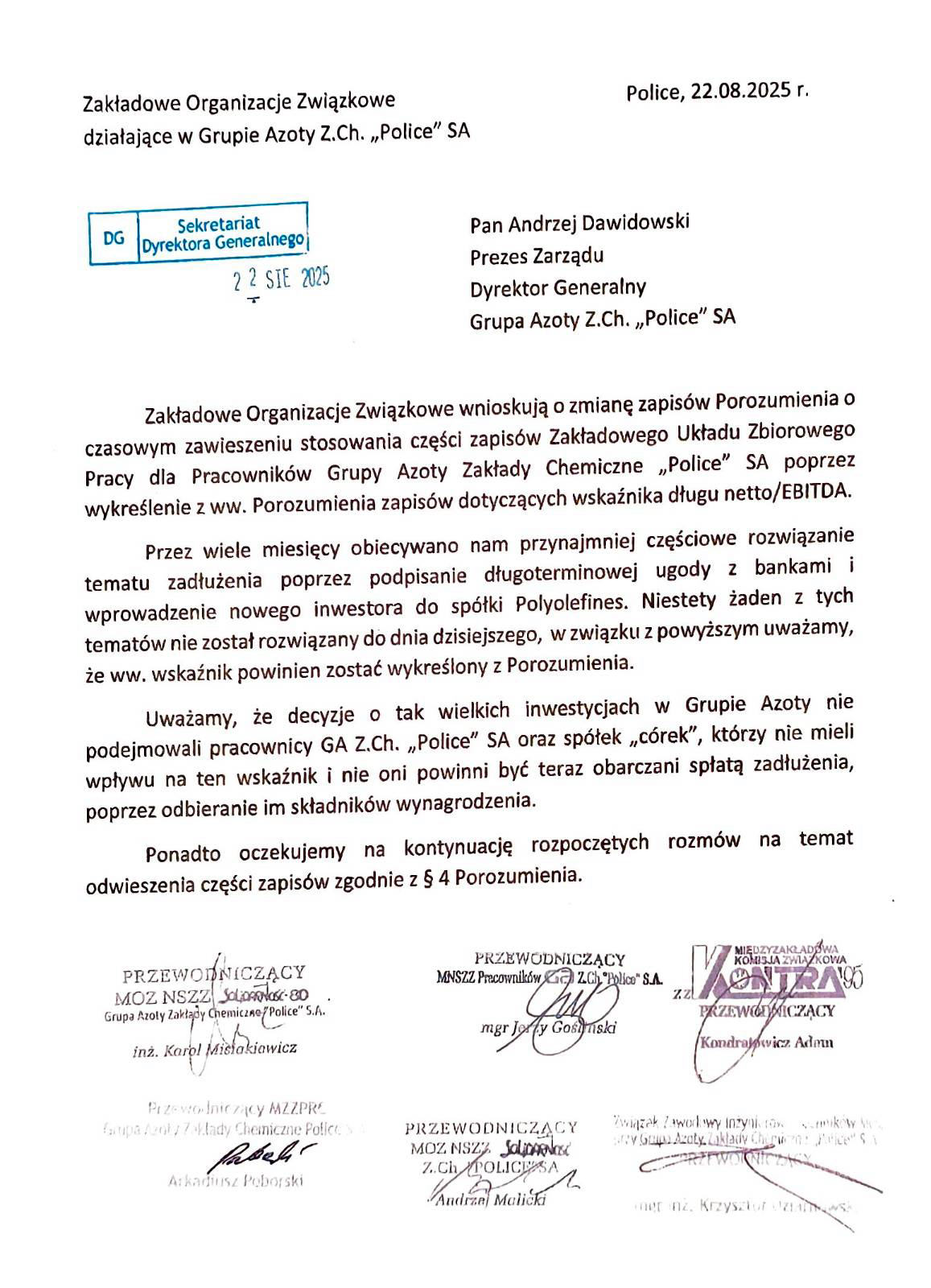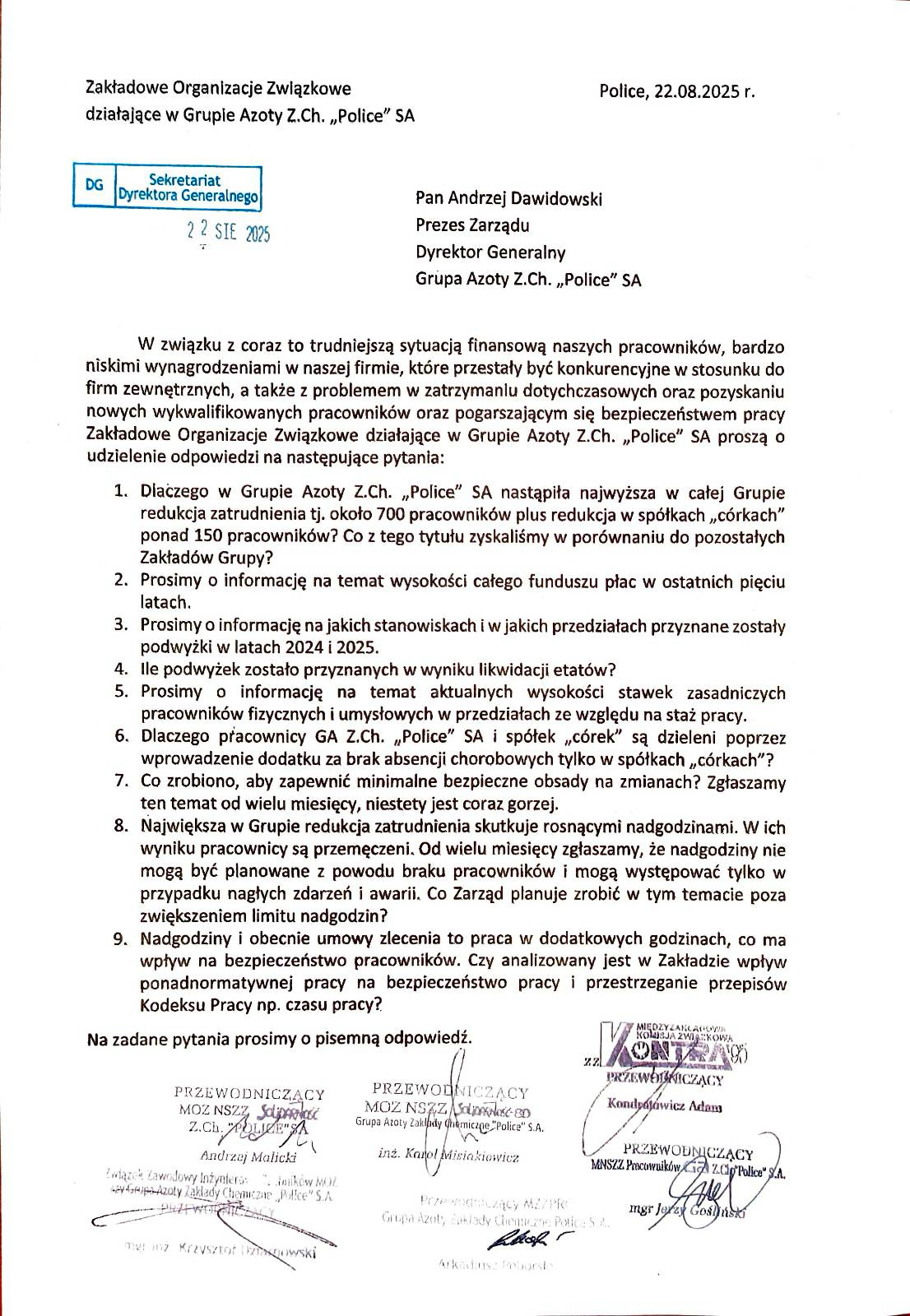 W związku z pogarszającymi się warunkami pracy i możliwościami godziwych zarobków organizacje związkowe po raz kolejny apelują do zarządu o podjęcie rozmów dotyczących poprawy warunków pracy oraz podwyższenia wynagrodzeń. Brak reakcji ze strony zarządu może skutkować dalszym pogorszeniem nastrojów wśród pracowników oraz rozważeniem innych form protestu, zwłaszcza że wielu pracowników rozważa odejście z firmy.